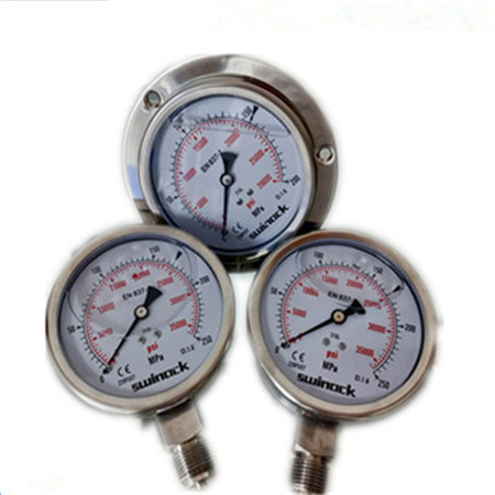 产品详情:超高压pressuregauge简介:此超高压表的工作压力可以达到6000bar。它具多种规格和特别的全不锈钢安全设计。顶部装有注液塞和内部补偿膜片。它具备抗冲击和阻尼性能。它可以以防由于振动而毁损压力表的内部,同时可以润滑内部组件并减小压力表的腐蚀。
